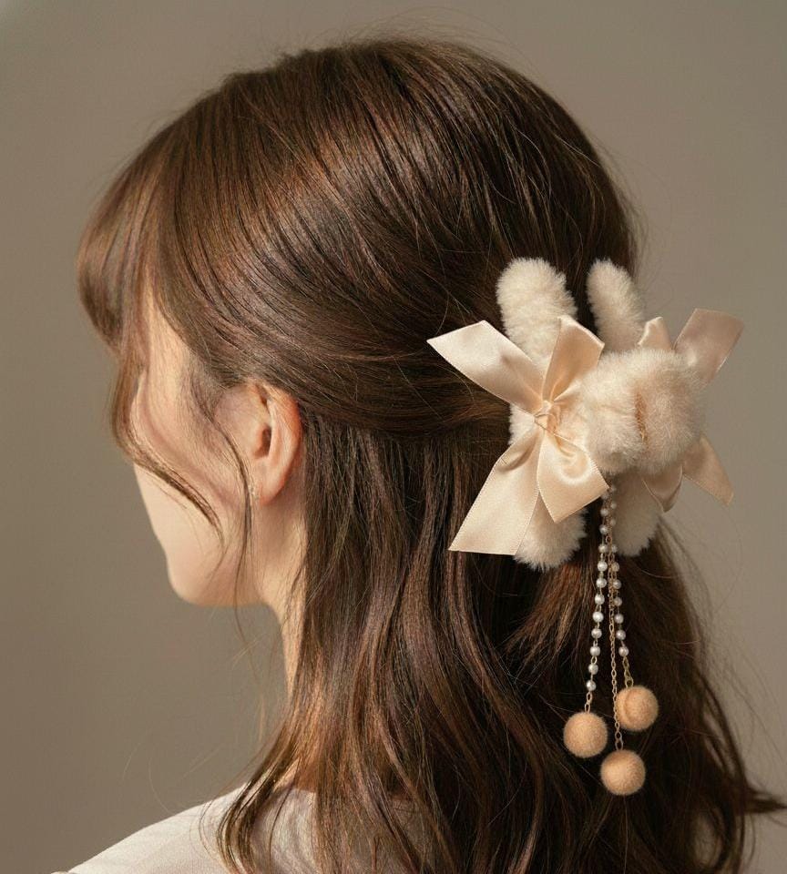 Fur Bow Pearl Drop Hair Claw