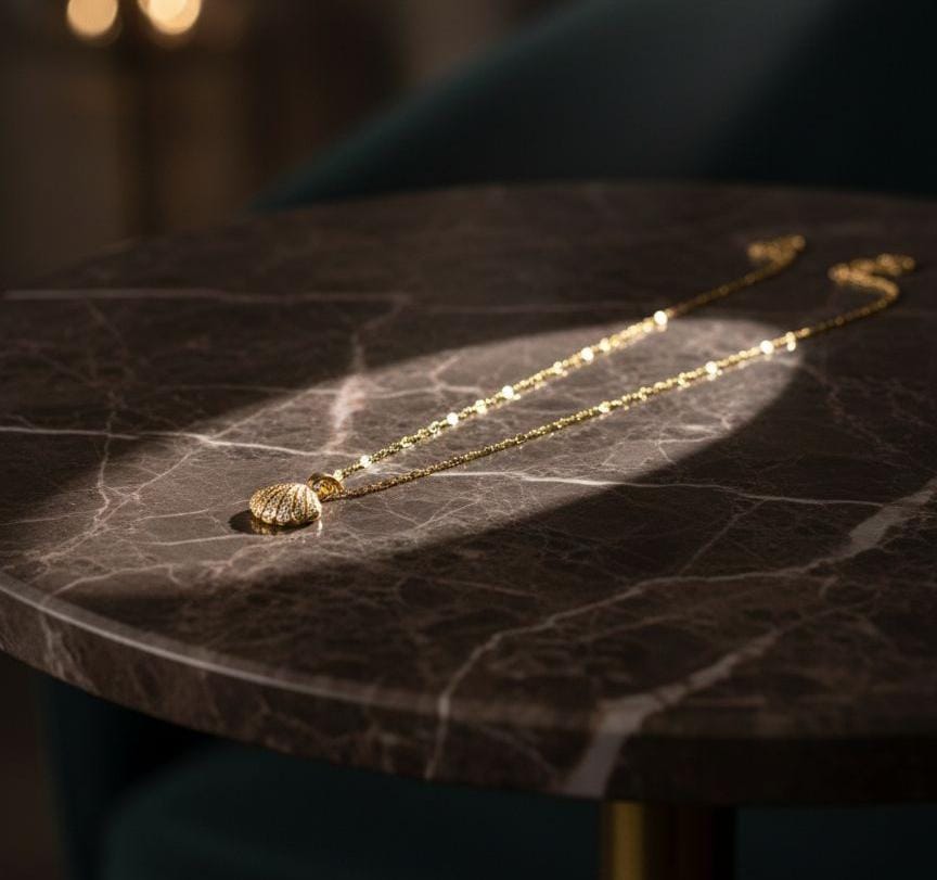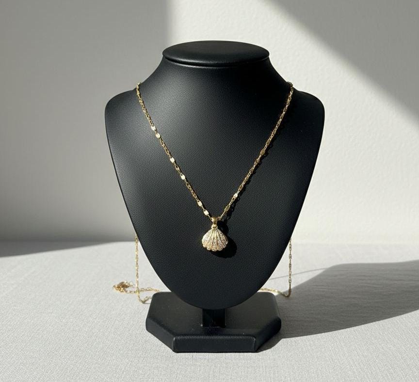 Inspired by the beauty of the ocean, this elegant seashell pendant captures a soft, graceful charm with a luxurious touch. Designed in a classic shell silhouette, the pendant features a finely textured surface that reflects light subtly, giving it a refined and sophisticated glow.