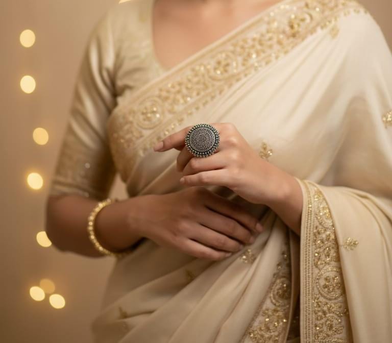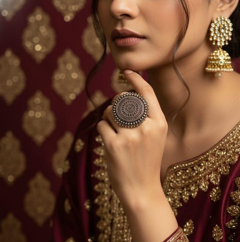 This elegant mandala-inspired ring showcases detailed circular craftsmanship with a classic antique finish that adds depth and character. Designed using high-quality premium metal, it is waterproof, anti-tarnish, and resistant to fading, ensuring long-lasting shine and durability. The finely textured surface gives it a rich, heritage look while remaining lightweight and comfortable for everyday wear. A perfect choice for festive occasions, ethnic outfits, or when you want to make a bold yet graceful style statement.